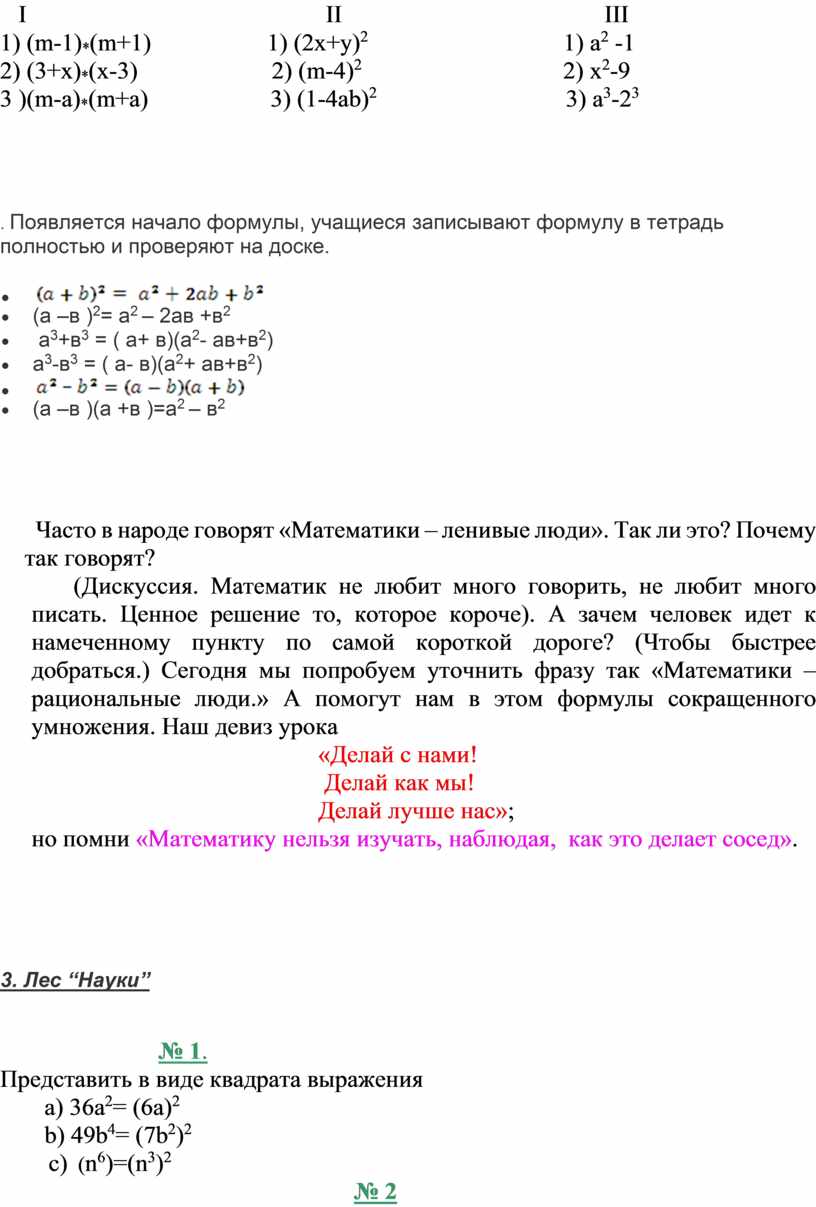 (Дискуссия. Математик не любит много говорить, не любит много писать. Ценное решение то, которое короче). А зачем человек идет к намеченному пункту по самой короткой дороге? (Чтобы быстрее добраться.) Сегодня мы попробуем уточнить фразу так «Математики – рациональные люди.» А помогут нам в этом формулы сокращенного умножения. Наш девиз урока
