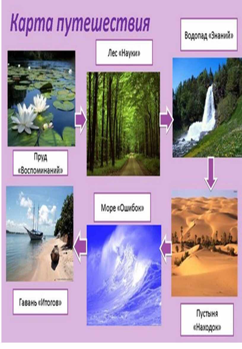 Поход начинаем у пруда “Воспоминаний” (вспомним какие формулы мы уже знаем). Далее наш путь через лес “Науки” (выполним задание по карточкам). Затем на нашем пути водопад “Знаний” (закрепим формулы при выполнении упражнений, выполним тест). От водопада направимся в пустыню “Находок” (применим наши знания формул при восстановлении тождеств). А далее нас ждёт море “Ошибок” (постараемся найти ошибки в выражениях). Закончим наш поход в гавани “Итогов”.