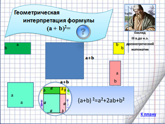 Доклад: Ещё в глубокой древности было подмечено, что некоторые многочлены можно умножать короче, быстрее, чем остальные. Первые общие утверждения о тождественных преобразованиях встречаются у древнегреческих математиков, начиная с шестого века до н.э. Среди математиков Древней Греции было принято выражать все алгебраические утверждения в геометрической форме. Вместо сложения чисел говорили о сложении отрезков, произведение двух чисел истолковывали как площадь прямоугольника. Отказ от геометрической трактовки наметился у Диофанта Александрийского, жившего в 3 веке. В его работах появляются зачатки буквенной символики и специальных обозначений. Формулы квадрата суммы и разности двух выражений знали еще в Древнем Вавилоне, а древнегреческие математики знали ее геометрическое истолкование. |