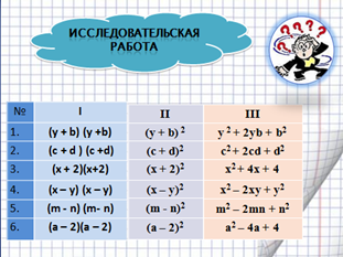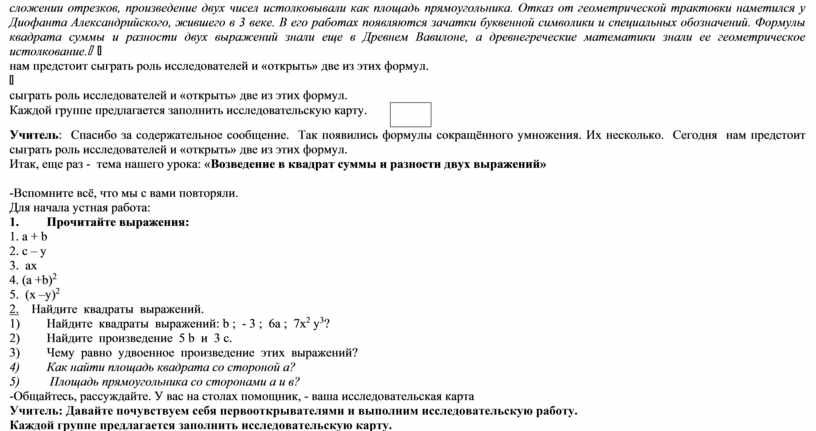 Учитель: Спасибо за содержательное сообщение. Так появились формулы сокращённого умножения. Их несколько. Сегодня нам предстоит сыграть роль исследователей и «открыть» две из этих формул. Итак, еще раз - тема нашего урока: «Возведение в квадрат суммы и разности двух выражений»