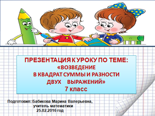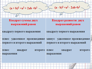 Тема: «Формулы сокращенного умножения. Возведение в квадрат суммы и разности двух выражений»