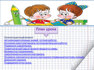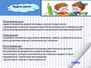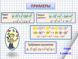 Научиться преобразовывать квадрат суммы или квадрат разности с помощью формул сокращенного умножения.