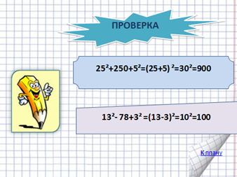 IV. Первичное закрепление Цель этапа: -организовать самопроверку и самооценку учащимися умения применять формулы сокращенного умножения -закрепить знание нового правила путём решения задач, работая в паре и самостоятельно