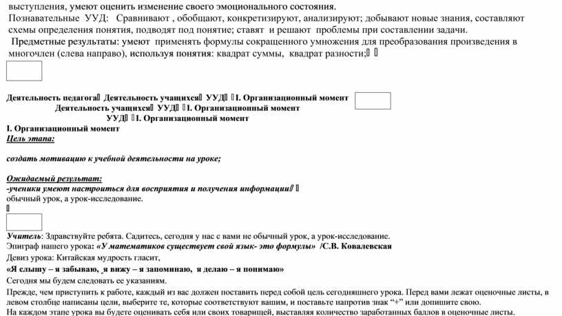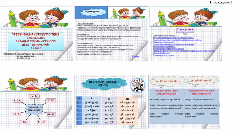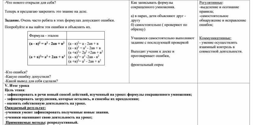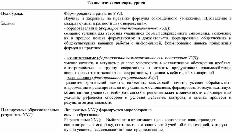 Формирование и развитие УУД. Изучить и закрепить на практике формулы сокращенного умножения. «Возведение в квадрат суммы и разности двух выражений». - образовательные (формирование познавательных УУД): создание условий для усвоения учащимися формул сокращенного умножения, включение их в процесс поиска формулировок и доказательств, формирование общеучебных и общекультурных навыков работы с информацией, формирование навыка применения формул на практике.