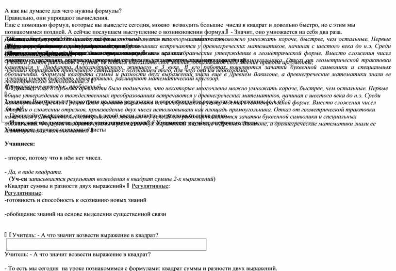 А как вы думаете для чего нужны формулы? Правильно, они упрощают вычисления. Еще с помощью формул, которые вы выведете сегодня, можно возводить большие числа в квадрат и довольно быстро, но с этим мы познакомимся поздней. А сейчас послушаем выступление о возникновении формул. |