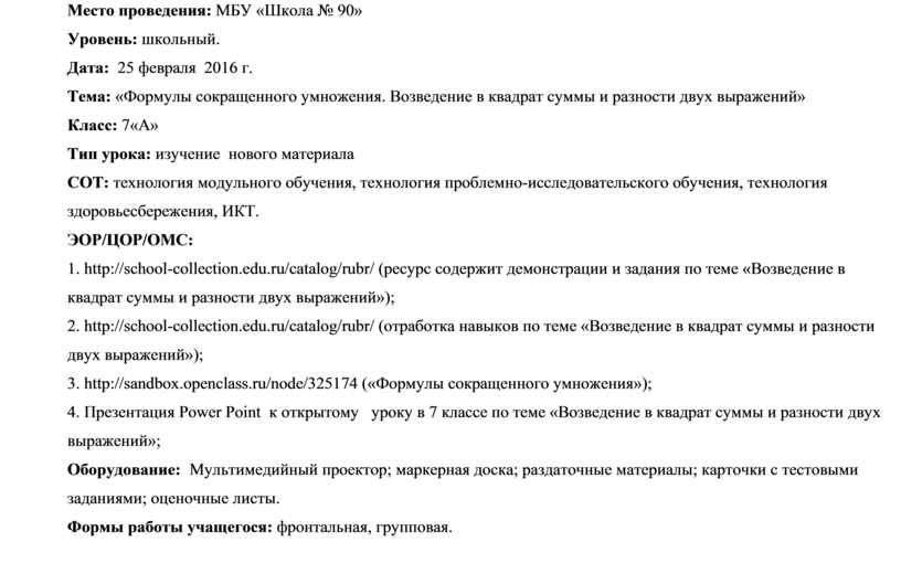 1. http://school-collection.edu.ru/catalog/rubr/ (ресурс содержит демонстрации и задания по теме «Возведение в квадрат суммы и разности двух выражений»);