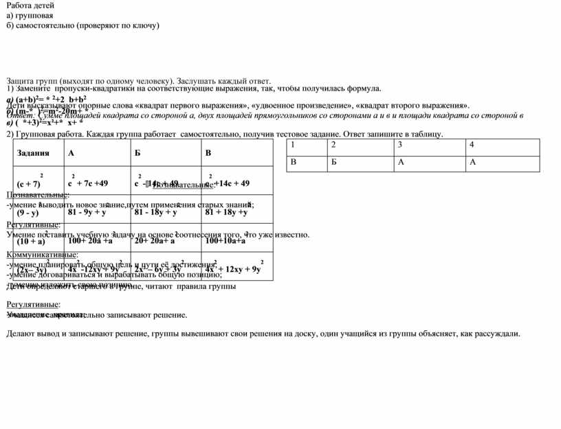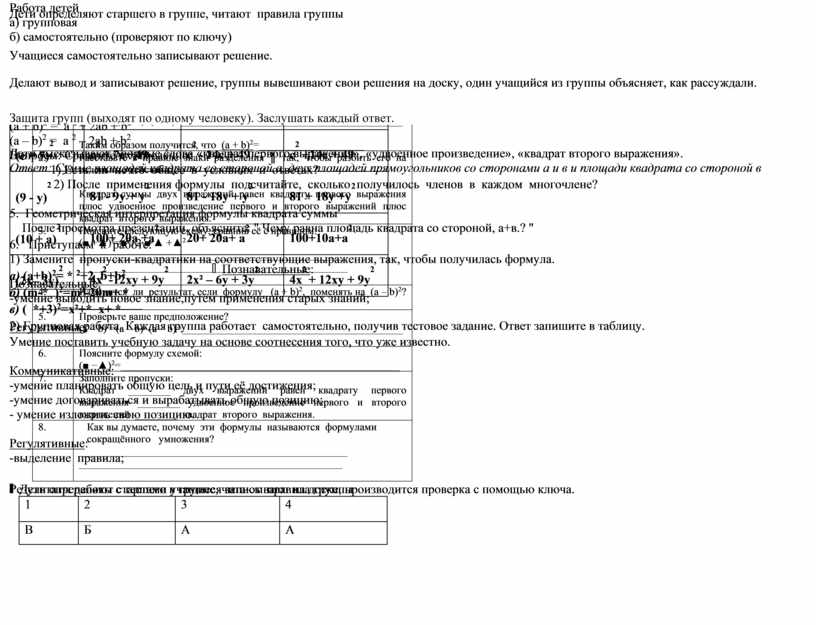 Дети высказывают опорные слова «квадрат первого выражения», «удвоенное произведение», «квадрат второго выражения». Ответ: Сумме площадей квадрата со стороной а, двух площадей прямоугольников со сторонами а и в и площади квадрата со стороной в Работа детей а) групповая б) самостоятельно (проверяют по ключу)