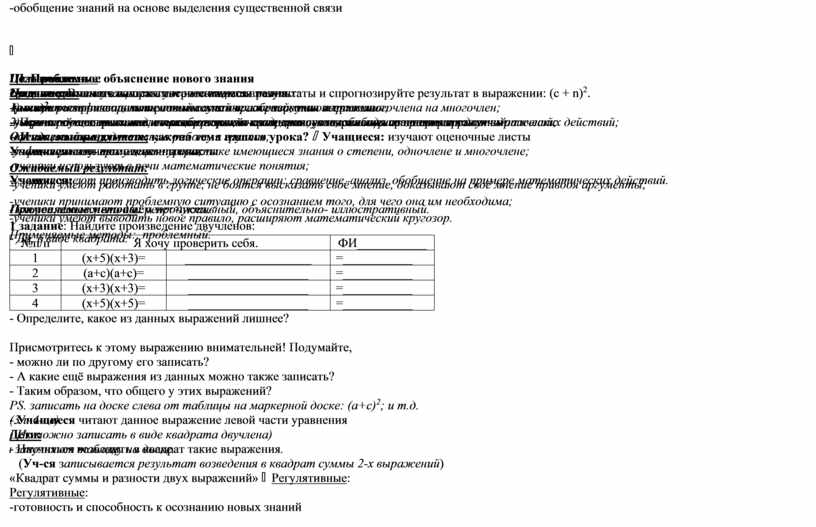 Личностные УУД: формируется мировоззрение, смыслообразование. Регулятивные УУД: Выбирают и принимают цель, составляют план, проводят самоконтроль, самооценку, соотносят свои знания с той учебной информацией, которую нужно усвоить; высказывают личное предположение. Коммуникативные УУД: Проводят взаимоконтроль, взаимопроверку, распределение обязанностей в группе, умеют слушать, выступать, рецензировать, писать текст (решение) выступления, умеют оценить изменение своего эмоционального состояния. Познавательные УУД: Сравнивают , обобщают, конкретизируют, анализируют; добывают новые знания, составляют схемы определения понятия, подводят под понятие; ставят и решают проблемы при составлении задачи. Предметные результаты: умеют применять формулы сокращенного умножения для преобразования произведения в многочлен (слева направо), используя понятия: квадрат суммы, квадрат разности; |