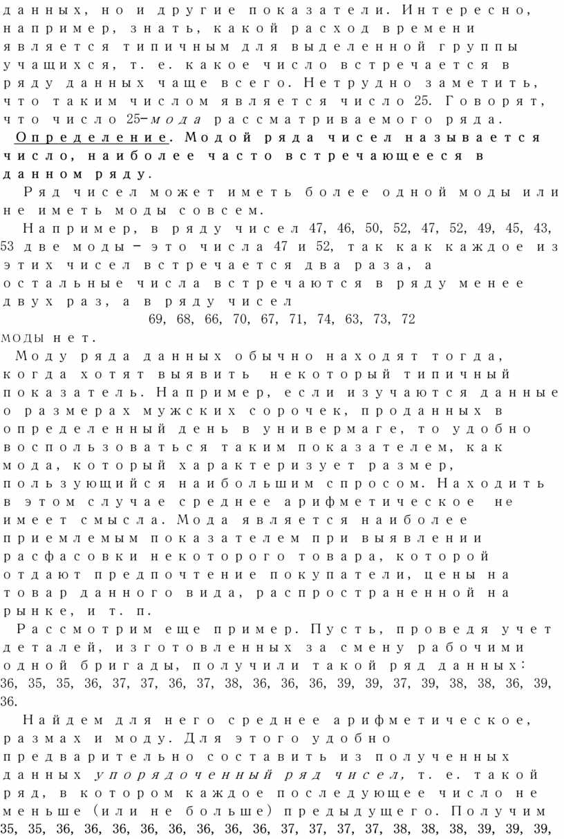 Заметим, что среднее арифметическое ряда чисел может не совпадать ни с одним из этих чисел, а мода, если она существует, обязательно совпадает с двумя или более числами ряда. Кроме того, в отличие от среднего арифметического, понятие «мода» относится не только к числовым данным. Например, проведя опрос учащихся, можно получить ряд данных, показывающий, каким видом спорта они предпочитают заниматься, какую из развлекательных телевизионных программ они считают наиболее интересной. Модой будут служить те ответы, которые встретятся чаще всего. Этим и объясняется само название «мода».
