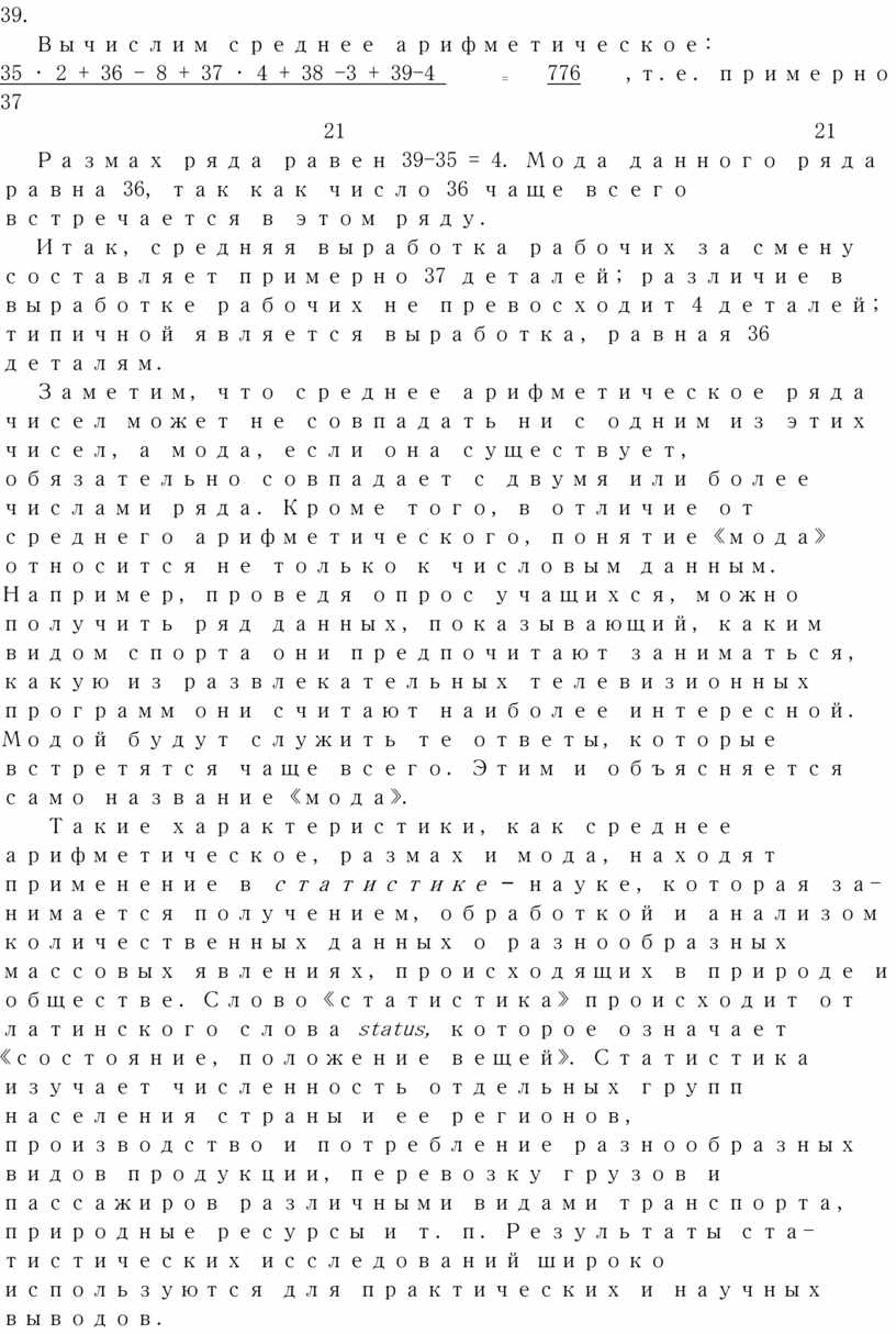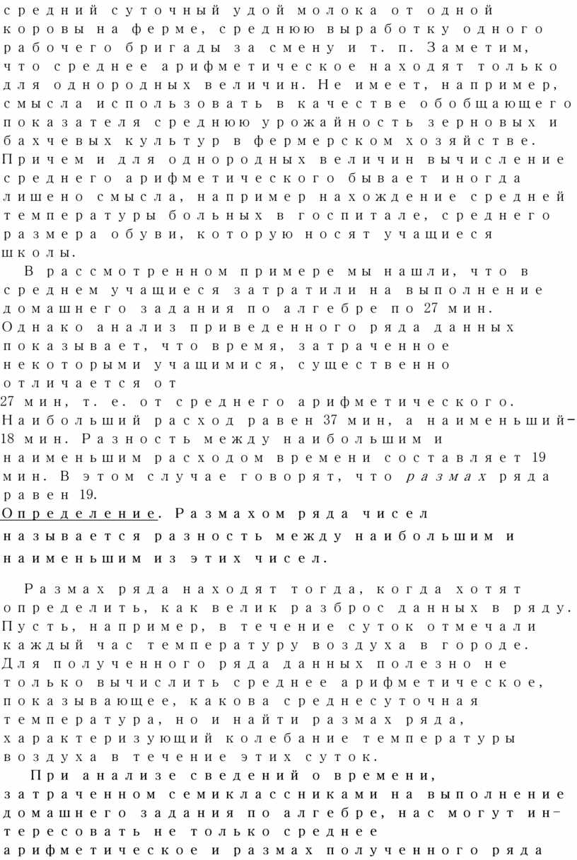 Обычно среднее арифметическое находят тогда, когда хотят определить среднее значение для некоторого ряда данных: среднюю урожайность пшеницы с 1 га в районе, средний суточный удой молока от одной коровы на ферме, среднюю выработку одного рабочего бригады за смену и т. п. Заметим, что среднее арифметическое находят только для однородных величин. Не имеет, например, смысла использовать в качестве обобщающего показателя среднюю урожайность зерновых и бахчевых культур в фермерском хозяйстве. Причем и для однородных величин вычисление среднего арифметического бывает иногда лишено смысла, например нахождение средней температуры больных в госпитале, среднего размера обуви, которую носят учащиеся школы.
