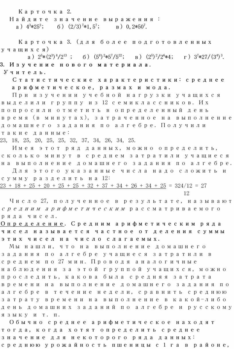 Мы нашли, что на выполнение домашнего задания по алгебре учащиеся затратили в среднем по 27 мин. Проводя аналогичные наблюдения за этой группой учащихся, можно проследить, какова была средняя затрата времени на выполнение домашнего задания по алгебре в течение недели, сравнить среднюю затрату времени на выполнение в какой-либо день домашних заданий по алгебре и русскому языку и т. п.