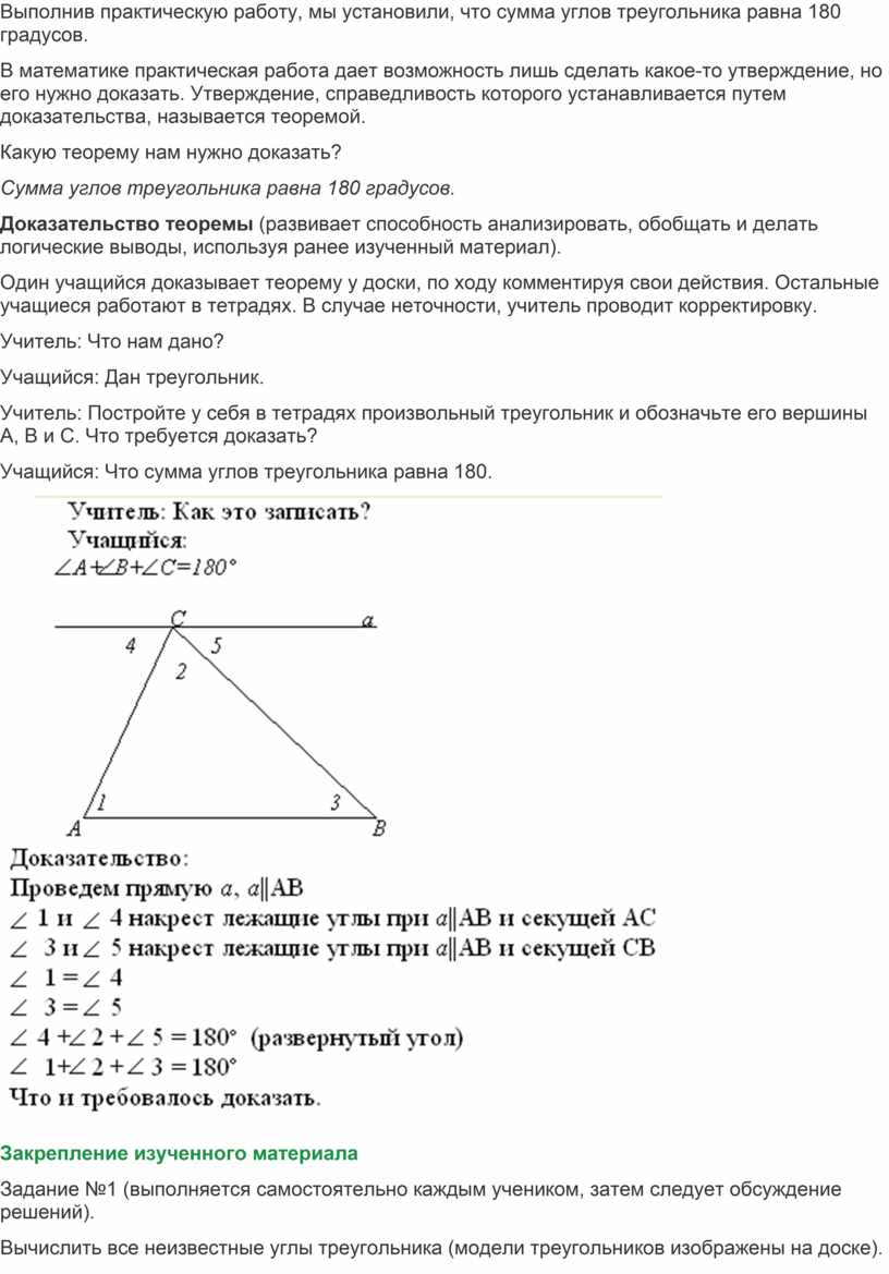 Выполнив практическую работу, мы установили, что сумма углов треугольника равна 180 градусов.