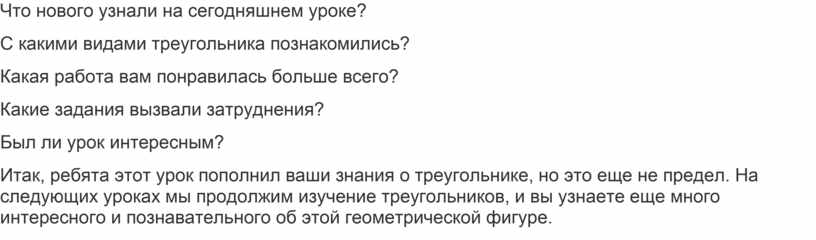 Итак, ребята этот урок пополнил ваши знания о треугольнике, но это еще не предел. На следующих уроках мы продолжим изучение треугольников, и вы узнаете еще много интересного и познавательного об этой геометрической фигуре.