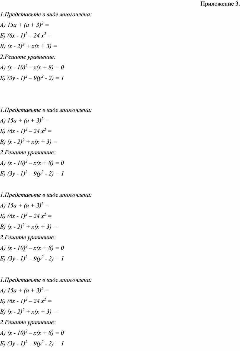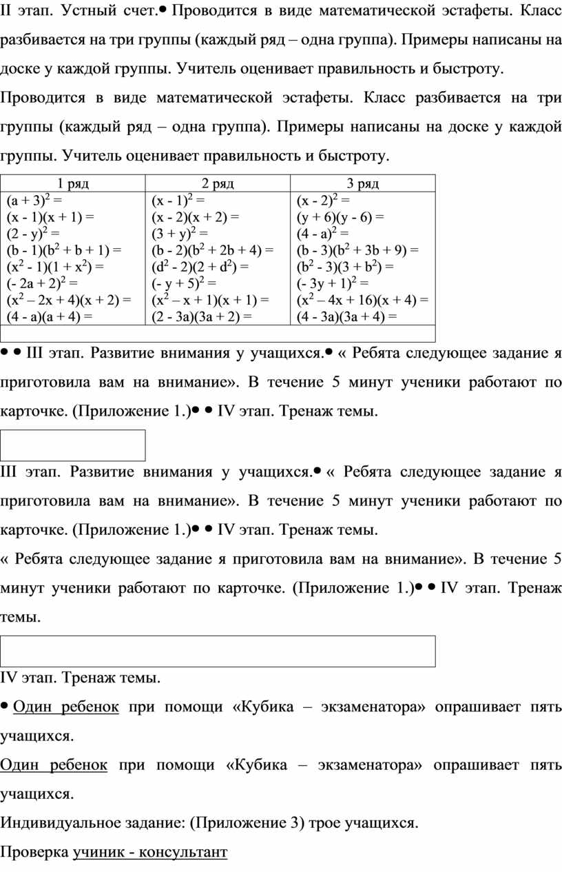 Один ребенок при помощи «Кубика – экзаменатора» опрашивает пять учащихся. Индивидуальное задание: (Приложение 3) трое учащихся. Проверка учиник - консультант Остальные: 1. Представьте в виде многочлена: А) 15а + (а + 3)2 = Б) (6х - 1)2 – 24 х2 = В) (х - 2)2 + х(х + 3) = 2. Решите уравнение: А) (х - 10)2 – х(х + 8) = 0 Б) (3у - 1)2 – 9(у2 - 2) = 1 |