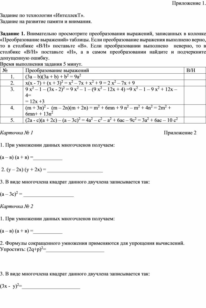 Задание 1. Внимательно просмотрите преобразования выражений, записанных в колонке «Преобразование выражений» таблицы. Если преобразование выражения выполнено верно, то в столбике «В/Н» поставьте «В». Если преобразовании выполнено неверно, то в столбике «В/Н» поставьте «Н», а в самом преобразовании найдите и подчеркните допущенную ошибку.