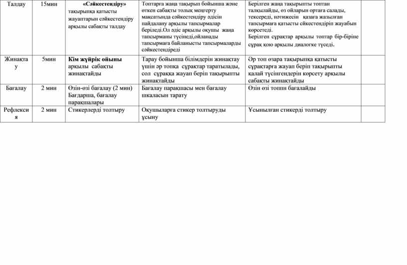 Топтарға жаңа тақырып бойынша және өткен сабақты толық меңгерту мақсатында сәйкестендіру әдісін пайдалану арқылы тапсырмалар беріледі.Ол әдіс арқылы оқушы жаңа тапсырманы түсінеді,ойланады тапсырмаға байланысты тапсырмаларды сәйкестендіреді |