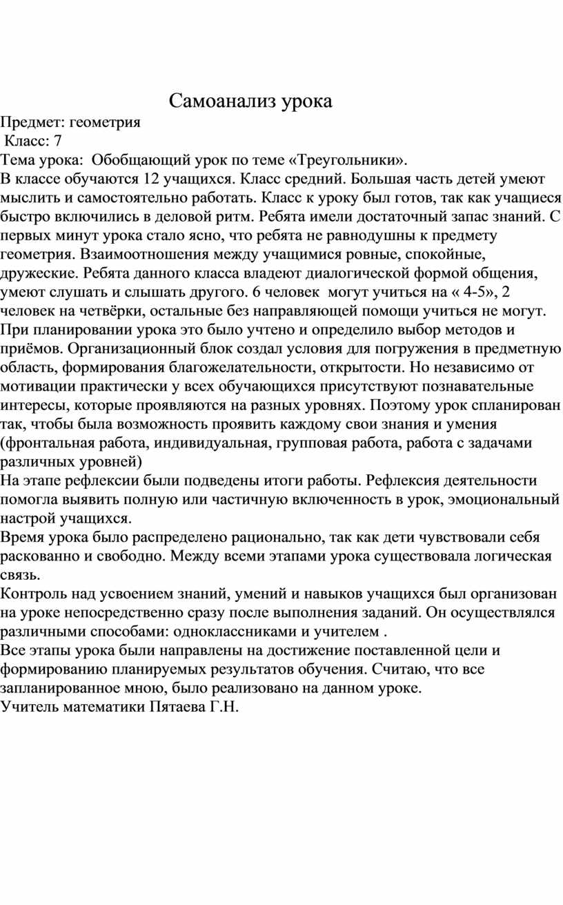 В классе обучаются 12 учащихся. Класс средний. Большая часть детей умеют мыслить и самостоятельно работать. Класс к уроку был готов, так как учащиеся быстро включились в деловой ритм. Ребята имели достаточный запас знаний. С первых минут урока стало ясно, что ребята не равнодушны к предмету геометрия. Взаимоотношения между учащимися ровные, спокойные, дружеские. Ребята данного класса владеют диалогической формой общения, умеют слушать и слышать другого. 6 человек могут учиться на « 4-5», 2 человек на четвёрки, остальные без направляющей помощи учиться не могут. При планировании урока это было учтено и определило выбор методов и приёмов. Организационный блок создал условия для погружения в предметную область, формирования благожелательности, открытости. Но независимо от мотивации практически у всех обучающихся присутствуют познавательные интересы, которые проявляются на разных уровнях. Поэтому урок спланирован так, чтобы была возможность проявить каждому свои знания и умения (фронтальная работа, индивидуальная, групповая работа, работа с задачами различных уровней)