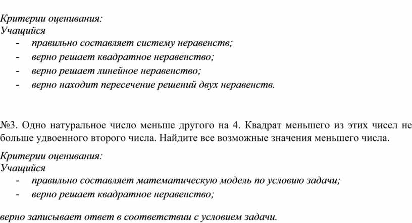 №3. Одно натуральное число меньше другого на 4. Квадрат меньшего из этих чисел не больше удвоенного второго числа. Найдите все возможные значения меньшего числа.