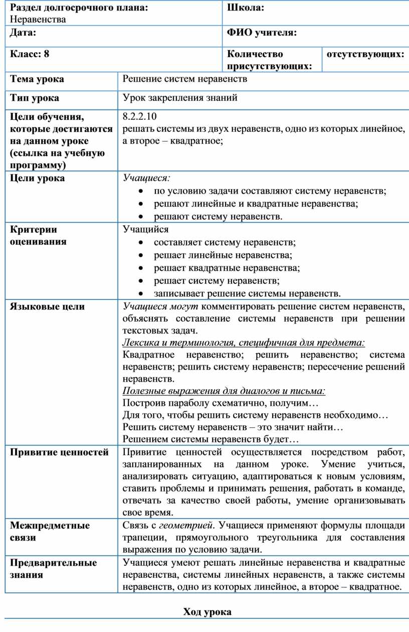 Учащийся · составляет систему неравенств; · решает линейные неравенства; · решает квадратные неравенства;