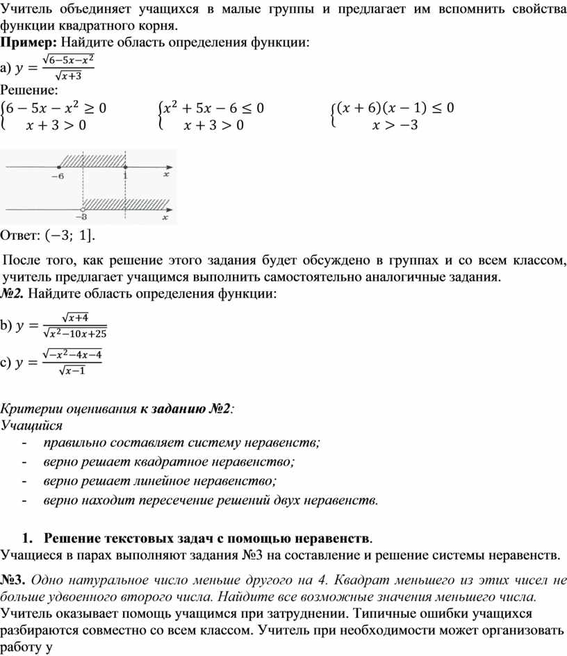 4. Нахождение области определения функции с помощью решения систем неравенств. Учитель объединяет учащихся в малые группы и предлагает им вспомнить свойства функции квадратного корня. Пример: Найдите область определения функции: а) Решение: