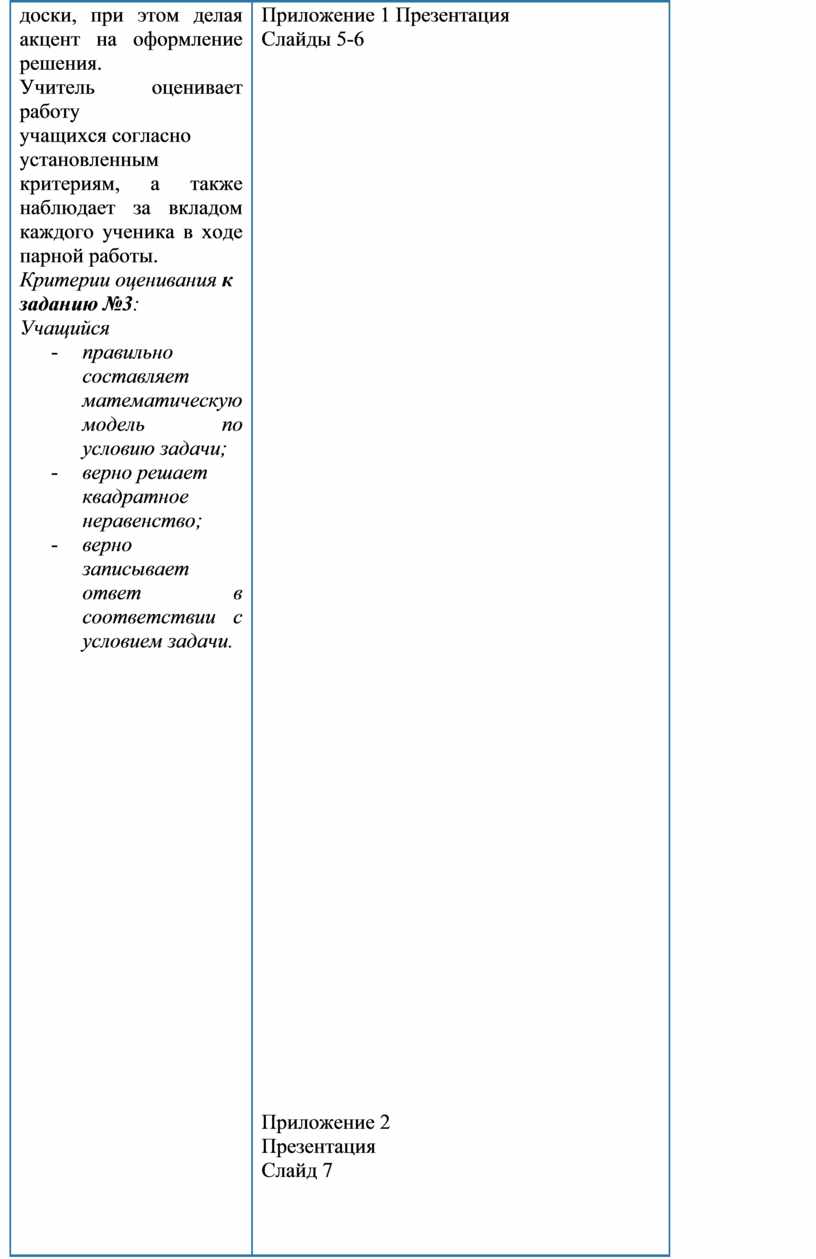 5. Решение текстовых задач с помощью неравенств. Учащиеся в парах выполняют задания №3 на составление и решение системы неравенств. №3. Одно натуральное число меньше другого на 4. Квадрат меньшего из этих чисел не больше удвоенного второго числа. Найдите все возможные значения меньшего числа. Учитель оказывает помощь учащимся при затруднении. Типичные ошибки учащихся разбираются совместно со всем классом. Учитель при необходимости может организовать работу у доски, при этом делая акцент на оформление решения. Учитель оценивает работу учащихся согласно установленным критериям, а также наблюдает за вкладом каждого ученика в ходе парной работы. Критерии оценивания к заданию №3: Учащийся - правильно составляет математическую модель по условию задачи; - верно решает квадратное неравенство; - верно записывает ответ в соответствии с условием задачи. |
