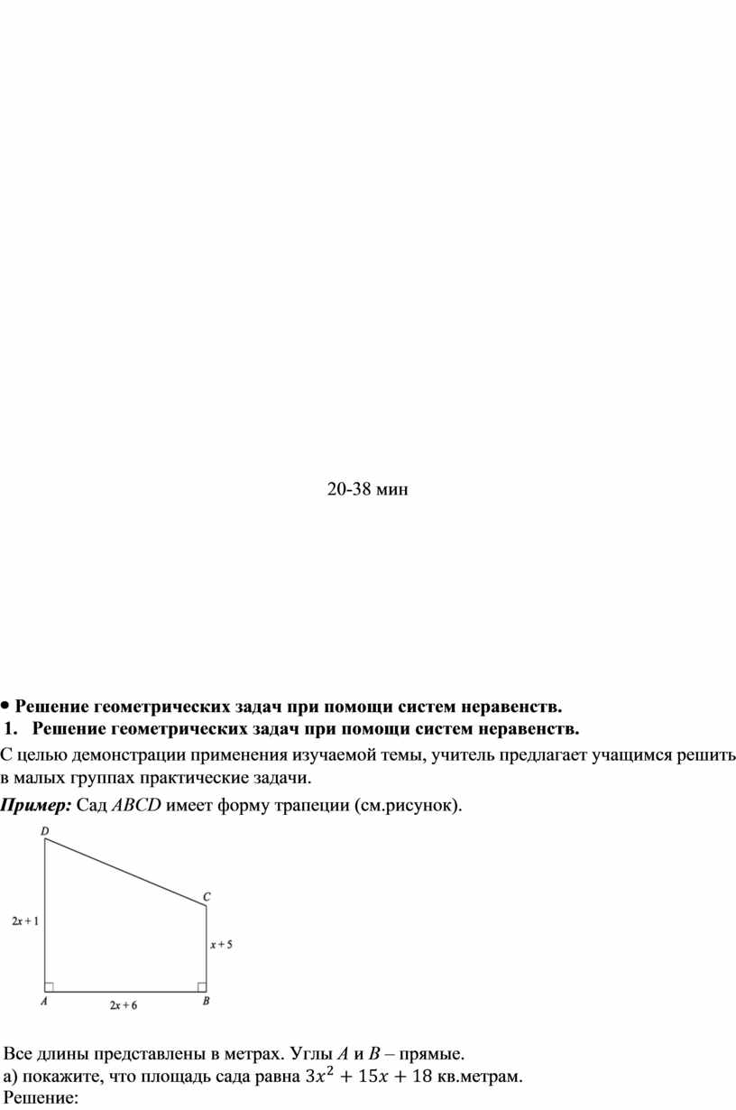 3. Решение геометрических задач при помощи систем неравенств. С целью демонстрации применения изучаемой темы, учитель предлагает учащимся решить в малых группах практические задачи. Пример: Сад ABCD имеет форму трапеции (см.рисунок).