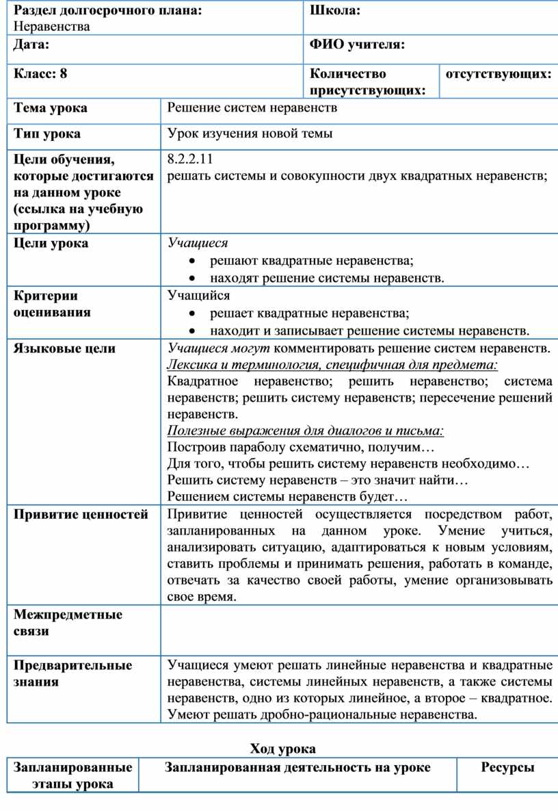 Учащиеся могут комментировать решение систем неравенств. Лексика и терминология, специфичная для предмета: Квадратное неравенство; решить неравенство; система неравенств; решить систему неравенств; пересечение решений неравенств. Полезные выражения для диалогов и письма: Построив параболу схематично, получим… Для того, чтобы решить систему неравенств необходимо… Решить систему неравенств – это значит найти… Решением системы неравенств будет… |