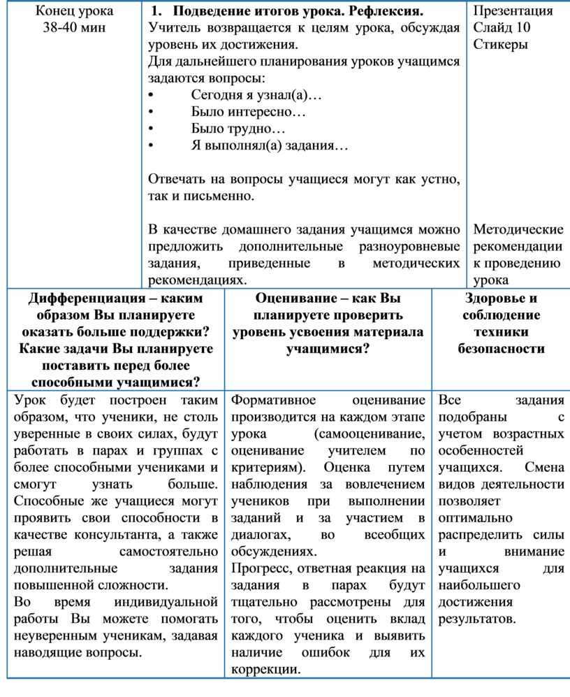 5. Подведение итогов урока. Рефлексия. Учитель возвращается к целям урока, обсуждая уровень их достижения. Для дальнейшего планирования уроков учащимся задаются вопросы: • Сегодня я узнал(а)… • Было интересно… • Было трудно… • Я выполнял(а) задания…