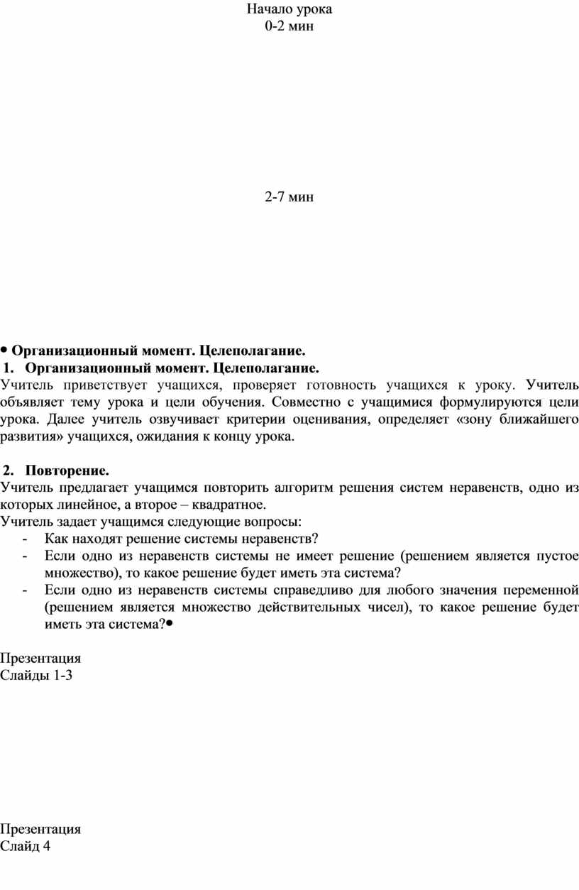 1. Организационный момент. Целеполагание. Учитель приветствует учащихся, проверяет готовность учащихся к уроку. Учитель объявляет тему урока и цели обучения. Совместно с учащимися формулируются цели урока. Далее учитель озвучивает критерии оценивания, определяет «зону ближайшего развития» учащихся, ожидания к концу урока.