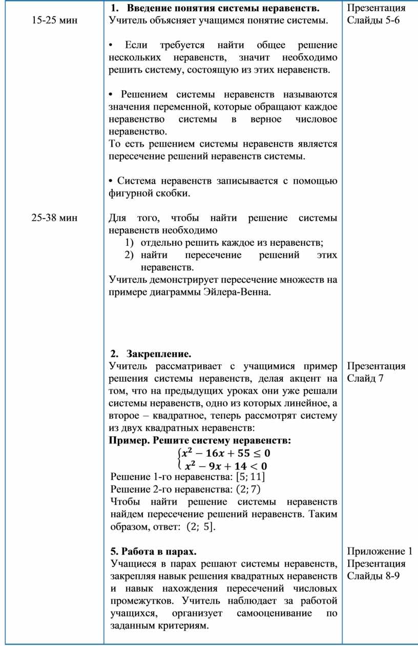 5. Работа в парах. Учащиеся в парах решают системы неравенств, закрепляя навык решения квадратных неравенств и навык нахождения пересечений числовых промежутков. Учитель наблюдает за работой учащихся, организует самооценивание по заданным критериям.