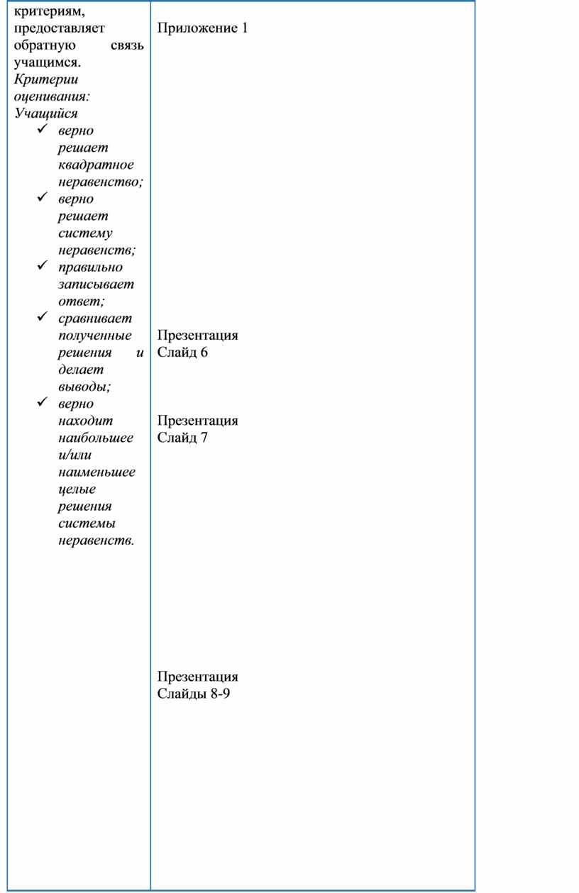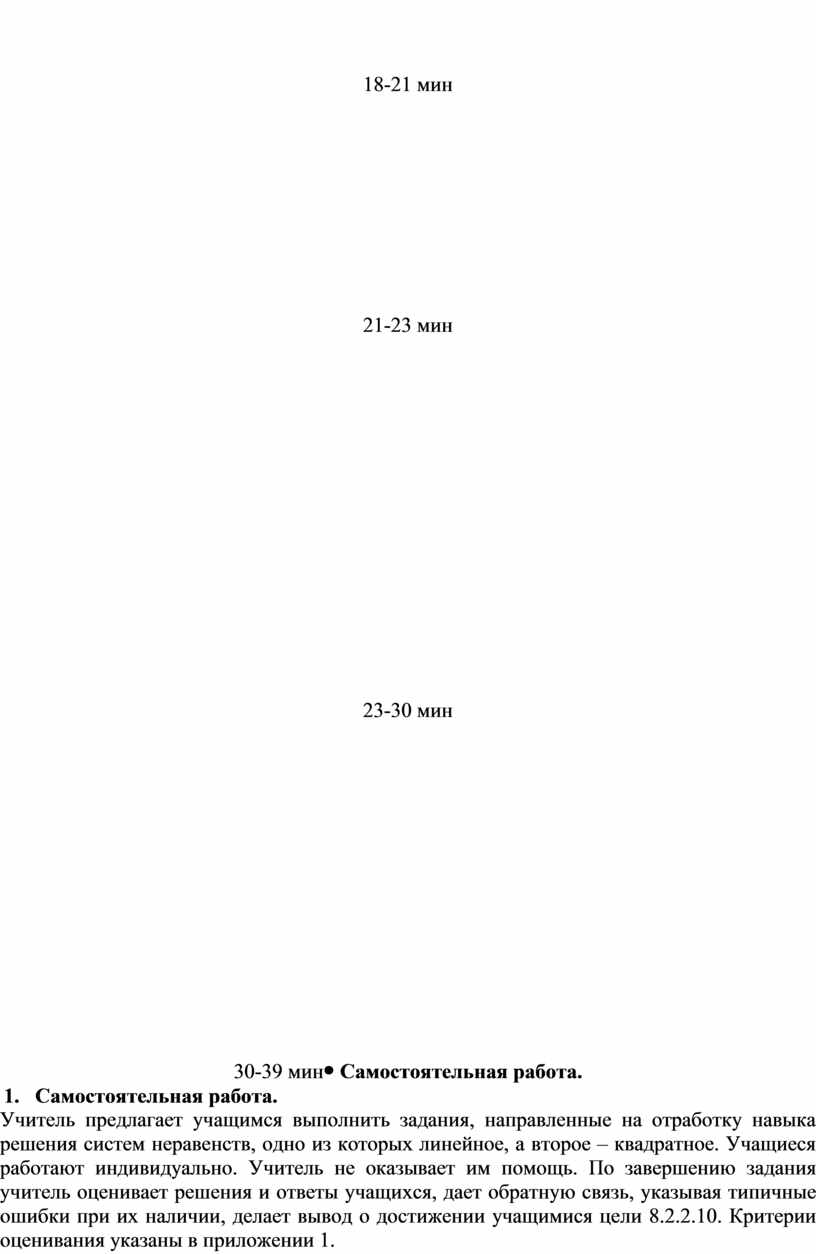 3. Самостоятельная работа. Учитель предлагает учащимся выполнить задания, направленные на отработку навыка решения систем неравенств, одно из которых линейное, а второе – квадратное. Учащиеся работают индивидуально. Учитель не оказывает им помощь. По завершению задания учитель оценивает решения и ответы учащихся, дает обратную связь, указывая типичные ошибки при их наличии, делает вывод о достижении учащимися цели 8.2.2.10. Критерии оценивания указаны в приложении 1.