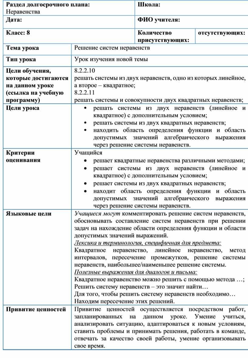 8.2.2.10 решать системы из двух неравенств, одно из которых линейное, а второе – квадратное; 8.2.2.11 решать системы и совокупности двух квадратных неравенств; |
