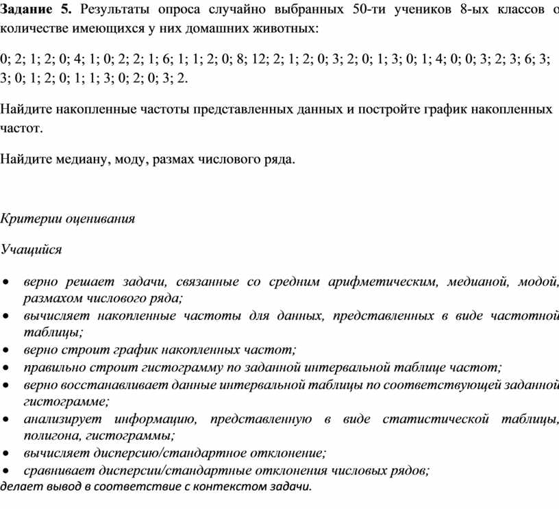 Задание 5. Результаты опроса случайно выбранных 50-ти учеников 8-ых классов о количестве имеющихся у них домашних животных: