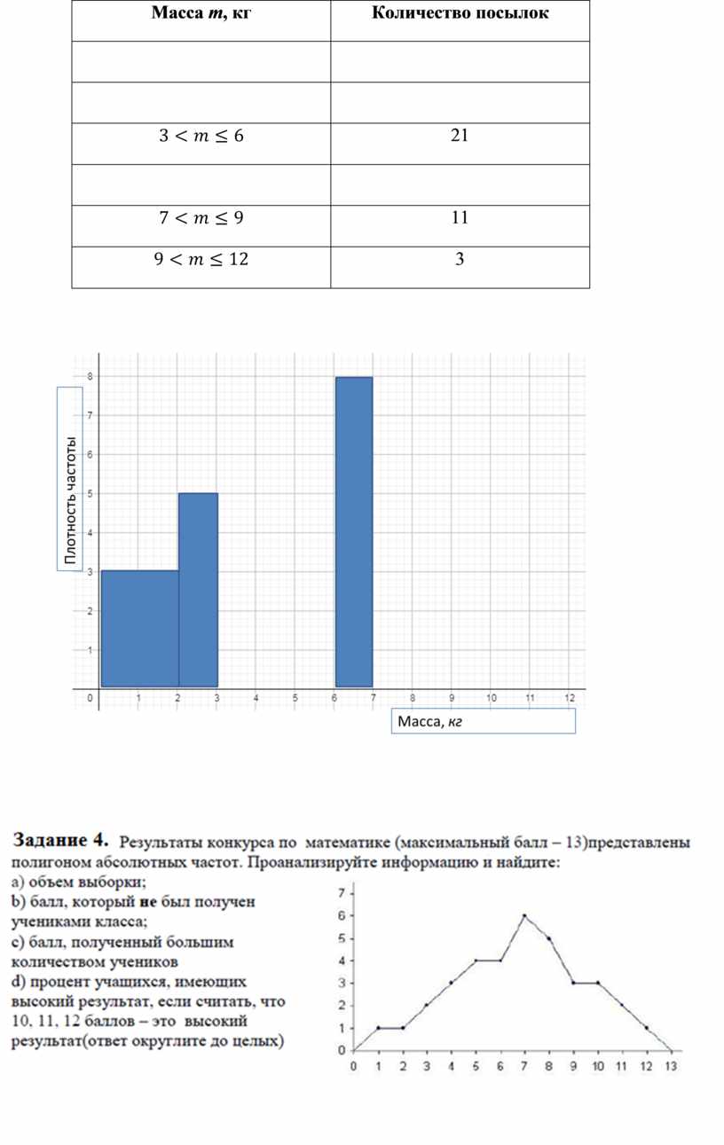 Задание 3. Данные о массе посылок в почтовом отделении города N, принятых почтовым отделением в течение недели, представлены в таблице и гистограмме: