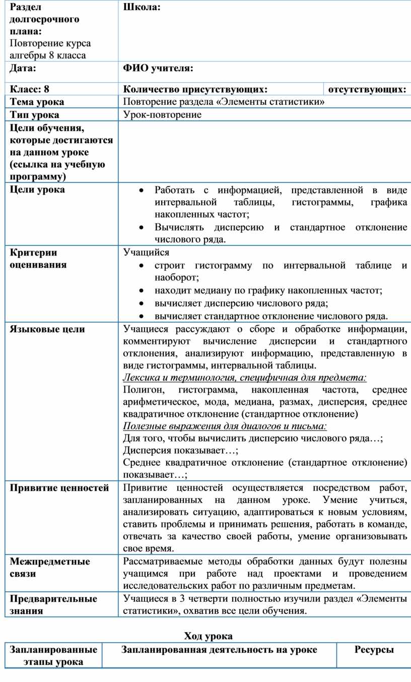 · Работать с информацией, представленной в виде интервальной таблицы, гистограммы, графика накопленных частот; · Вычислять дисперсию и стандартное отклонение числового ряда. |