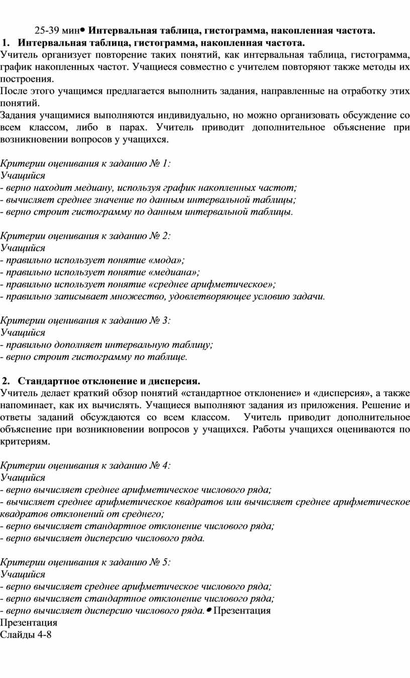 4. Стандартное отклонение и дисперсия. Учитель делает краткий обзор понятий «стандартное отклонение» и «дисперсия», а также напоминает, как их вычислять. Учащиеся выполняют задания из приложения. Решение и ответы заданий обсуждаются со всем классом. Учитель приводит дополнительное объяснение при возникновении вопросов у учащихся. Работы учащихся оцениваются по критериям.