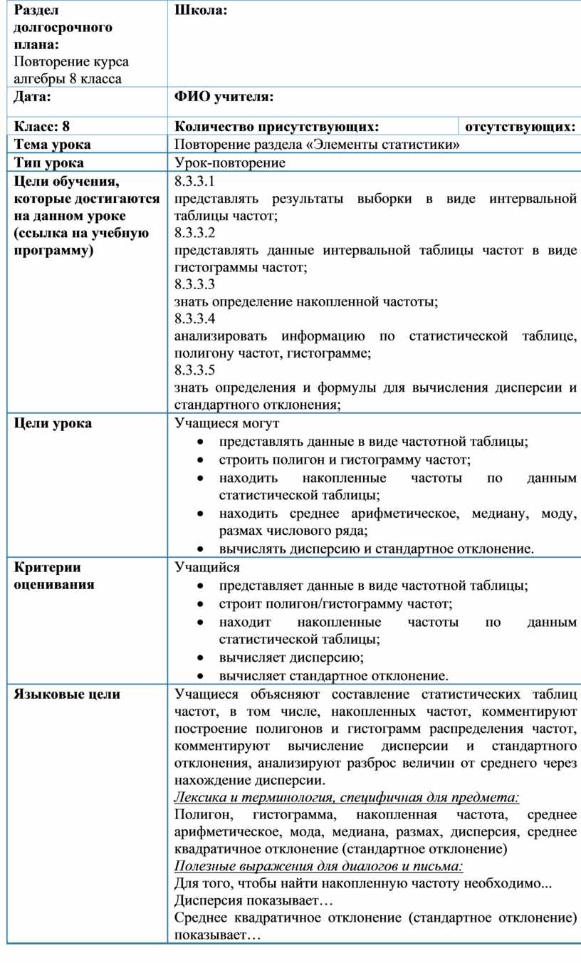 Учащиеся объясняют составление статистических таблиц частот, в том числе, накопленных частот, комментируют построение полигонов и гистограмм распределения частот, комментируют вычисление дисперсии и стандартного отклонения, анализируют разброс величин от среднего через нахождение дисперсии. Лексика и терминология, специфичная для предмета: Полигон, гистограмма, накопленная частота, среднее арифметическое, мода, медиана, размах, дисперсия, среднее квадратичное отклонение (стандартное отклонение) Полезные выражения для диалогов и письма: Для того, чтобы найти накопленную частоту необходимо... Дисперсия показывает… Среднее квадратичное отклонение (стандартное отклонение) показывает… |