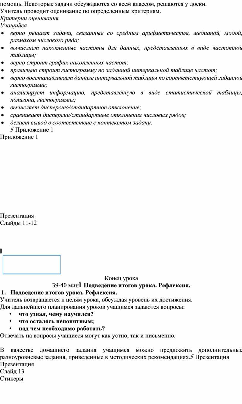 3. Решение задач. Учитель предлагает учащимся решить различные задачи по разделу «Элементы статистики», направленные на нахождение таких числовых характеристик числового ряда, как среднее арифметическое, мода, медиана, размах, дисперсия и стандартное отклонение, а также на нахождение накопленных частот, составление статистических таблиц и построение гистограмм. Учащиеся решают задачи самостоятельно. Учитель при необходимости может оказывать им помощь. Некоторые задачи обсуждаются со всем классом, решаются у доски. Учитель проводит оценивание по определенным критериям. Критерии оценивания Учащийся · верно решает задачи, связанные со средним арифметическим, медианой, модой, размахом числового ряда; · вычисляет накопленные частоты для данных, представленных в виде частотной таблицы; · верно строит график накопленных частот; · правильно строит гистограмму по заданной интервальной таблице частот; · верно восстанавливает данные интервальной таблицы по соответствующей заданной гистограмме; · анализирует информацию, представленную в виде статистической таблицы, полигона, гистограммы; · вычисляет дисперсию/стандартное отклонение; · сравнивает дисперсии/стандартные отклонения числовых рядов; · делает вывод в соответствие с контекстом задачи.