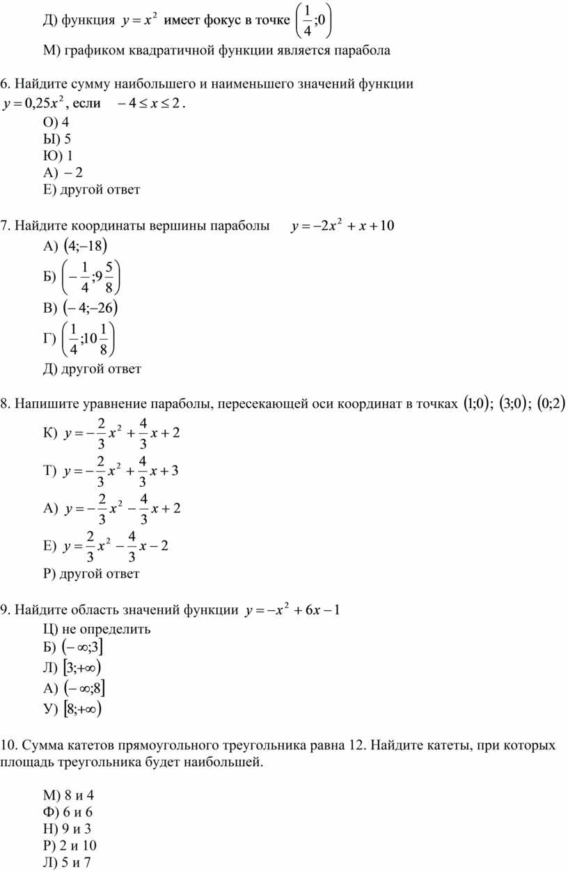 Приложение 2. Тест «Квадратичная функция».