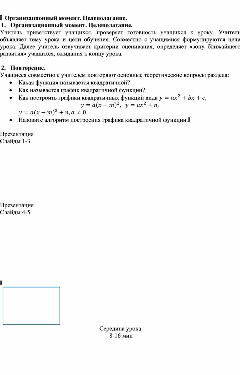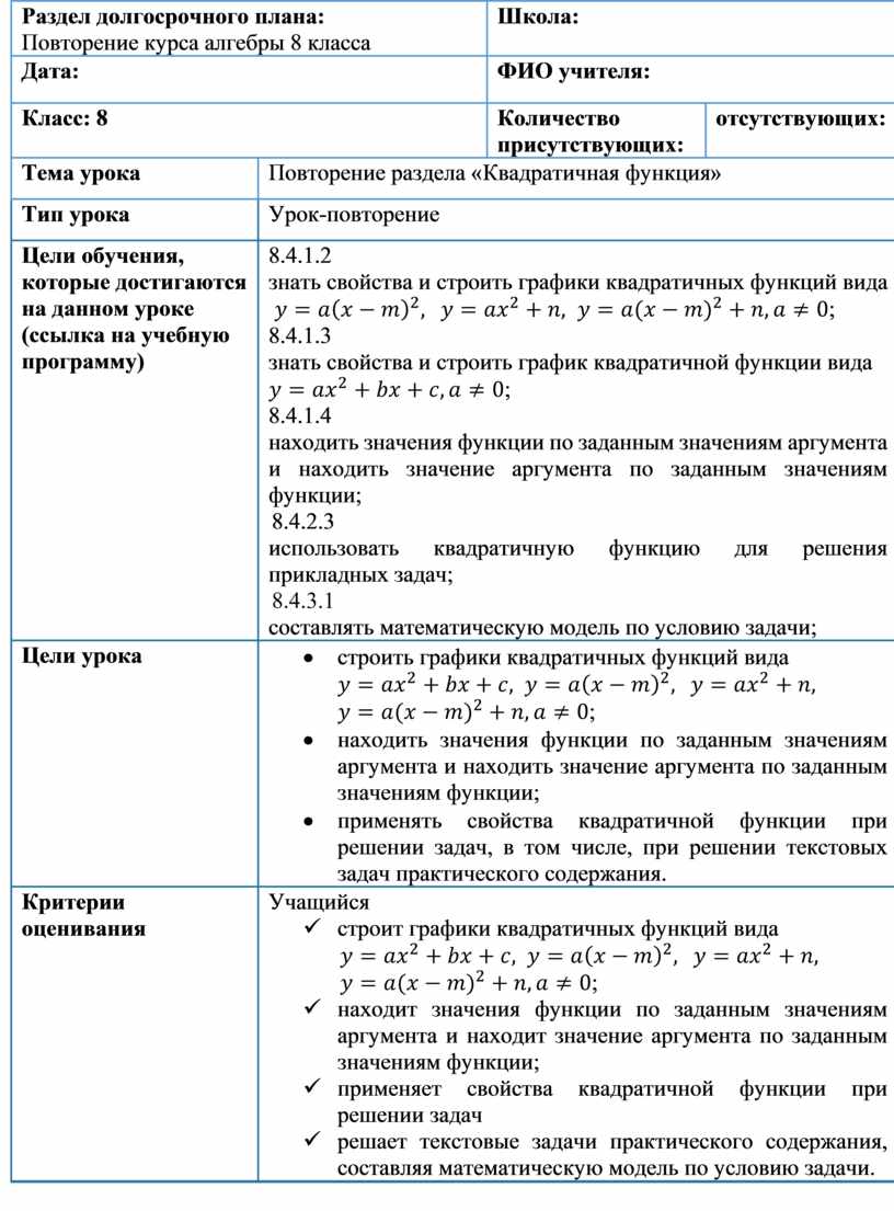 8.4.1.2 знать свойства и строить графики квадратичных функций вида 8.4.1.3 знать свойства и строить график квадратичной функции вида