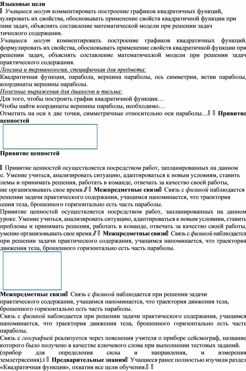 Учащиеся могут комментировать построение графиков квадратичных функций, формулировать их свойства, обосновывать применение свойств квадратичной функции при решении задач, объяснять составление математической модели при решении задач практического содержания. Лексика и терминология, специфичная для предмета: Квадратичная функция, парабола, вершина параболы, ось симметрии, ветви параболы, координаты вершины параболы. Полезные выражения для диалогов и письма: Для того, чтобы построить график квадратичной функции… Чтобы найти координаты вершины параболы, необходимо… Отметить на оси х две точки, симметричные относительно оси параболы… |