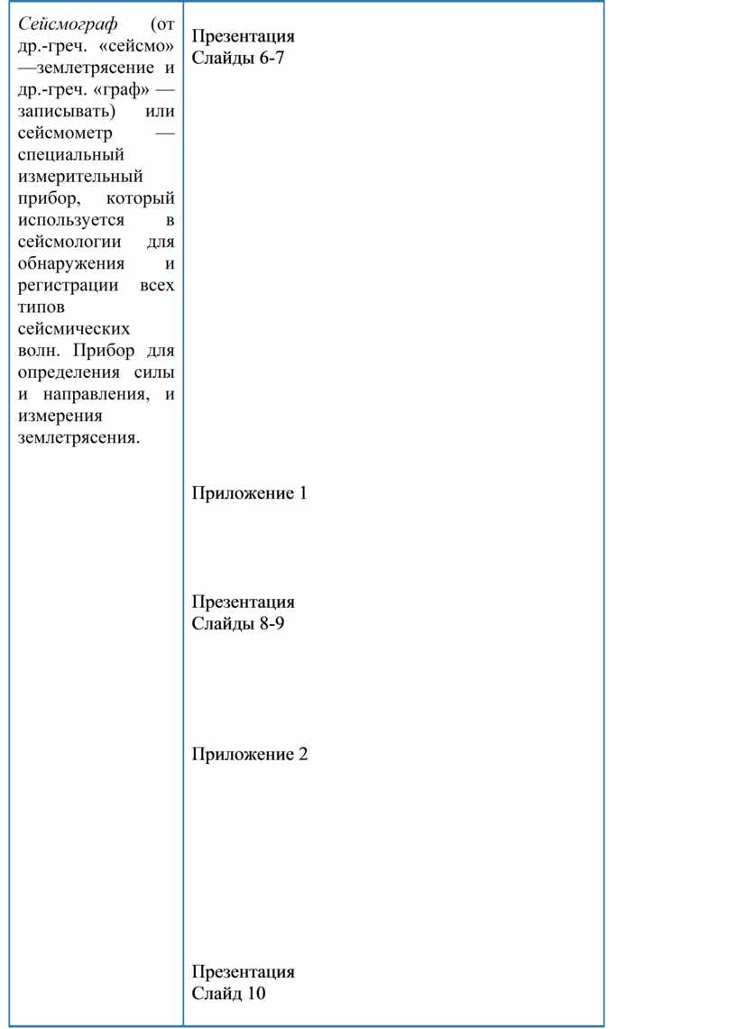 Связь с физикой наблюдается при решении задачи практического содержания, учащимся напоминается, что траектория движения тела, брошенного горизонтально есть часть параболы. Связь с географией реализуется через пояснения учителя о приборе сейсмограф, название которого было получено в качестве ключевого слова при выполнении тестовых заданий. (прибор для определения силы и направления, и измерения землетрясения). |