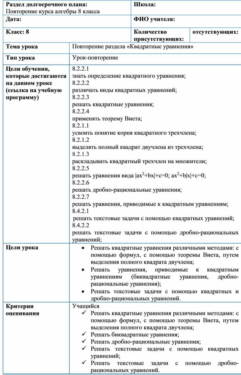 8.2.2.1 знать определение квадратного уравнения; 8.2.2.2 различать виды квадратных уравнений; 8.2.2.3 решать квадратные уравнения; 8.2.2.4 применять теорему Виета; 8.2.1.1 усвоить понятие корня квадратного трехчлена; 8.2.1.2 выделять полный квадрат двучлена из трехчлена; 8.2.1.3 раскладывать квадратный трехчлен на множители; 8.2.2.5 решать уравнения вида |ax2+bx|+c=0; ax2+b|x|+c=0; 8.2.2.6 решать дробно-рациональные уравнения; 8.2.2.7 решать уравнения, приводимые к квадратным уравнениям; 8.4.2.1 решать текстовые задачи с помощью квадратных уравнений; 8.4.2.2 решать текстовые задачи с помощью дробно-рациональных уравнений; |
