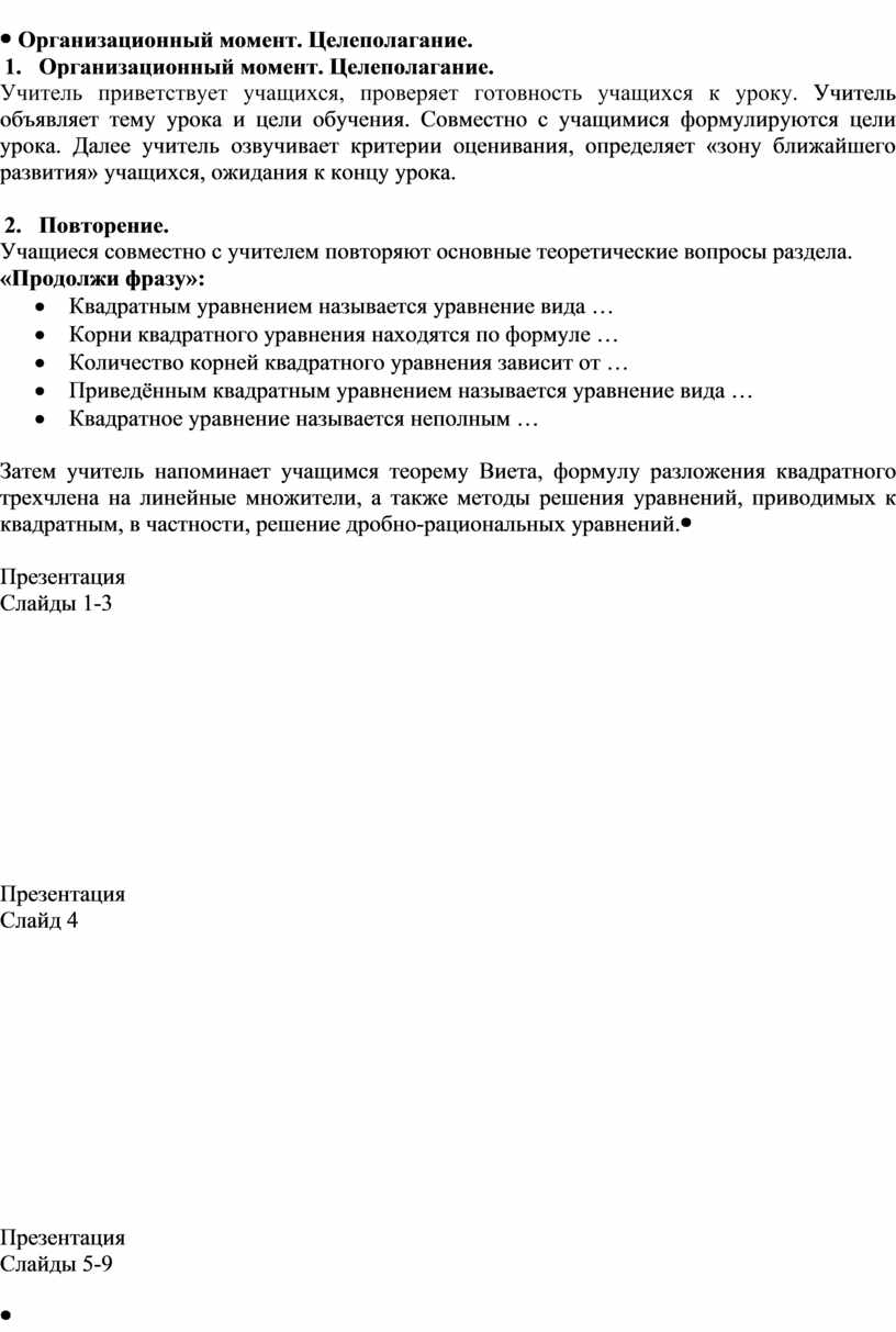 Затем учитель напоминает учащимся теорему Виета, формулу разложения квадратного трехчлена на линейные множители, а также методы решения уравнений, приводимых к квадратным, в частности, решение дробно-рациональных уравнений. |