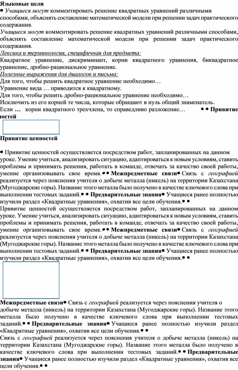 Учащиеся могут комментировать решение квадратных уравнений различными способами, объяснять составление математической модели при решении задач практического содержания. Лексика и терминология, специфичная для предмета: Квадратное уравнение, дискриминант, корни квадратного уравнения, биквадратное уравнение, дробно-рациональное уравнение. Полезные выражения для диалогов и письма: Для того, чтобы решить квадратное уравнение необходимо… Уравнение вида … приводится к квадратному. Для того, чтобы решить дробно-рациональное уравнение необходимо… Исключить из его корней те числа, которые обращают в нуль общий знаменатель. Если … корни квадратного трехчлена, то справедливо разложение… |