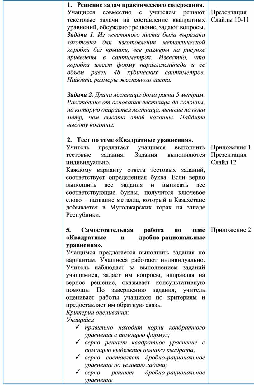 5. Самостоятельная работа по теме «Квадратные и дробно-рациональные уравнения». Учащимся предлагается выполнить задания по вариантам. Учащиеся работают индивидуально. Учитель наблюдает за выполнением заданий учащимися, задает им вопросы, направляя на верное решение, оказывает консультативную помощь. По завершению задания, учитель оценивает работы учащихся по критериям и предоставляет им обратную связь. Критерии оценивания: Учащийся ü правильно находит корни квадратного уравнения с помощью формул; ü верно решает квадратное уравнение с помощью выделения полного квадрата; ü верно составляет дробно-рациональное уравнение по условию задачи; ü верно решает дробно-рациональное уравнение. |