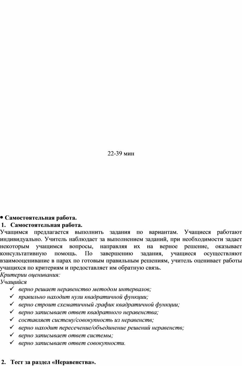 3. Самостоятельная работа. Учащимся предлагается выполнить задания по вариантам. Учащиеся работают индивидуально. Учитель наблюдает за выполнением заданий, при необходимости задает некоторым учащимся вопросы, направляя их на верное решение, оказывает консультативную помощь. По завершению задания, учащиеся осуществляют взаимооценивание в парах по готовым правильным решениям, учитель оценивает работы учащихся по критериям и предоставляет им обратную связь. Критерии оценивания: Учащийся ü верно решает неравенство методом интервалов; ü правильно находит нули квадратичной функции; ü верно строит схематичный график квадратичной функции; ü верно записывает ответ квадратного неравенства; ü составляет систему/совокупность из неравенств; ü верно находит пересечение/объединение решений неравенств; ü верно записывает ответ системы; ü верно записывает ответ совокупности.