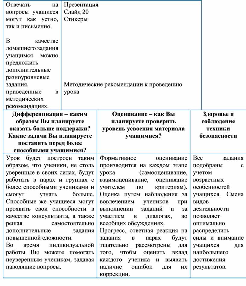 Формативное оценивание производится на каждом этапе урока (самооценивание, взаимоценивание, оценивание учителем по критериям). Оценка путем наблюдения за вовлечением учеников при выполнении заданий и за участием в диалогах, во всеобщих обсуждениях. Прогресс, ответная реакция на задания в парах будут тщательно рассмотрены для того, чтобы оценить вклад каждого ученика и выявить наличие ошибок для их коррекции. |
