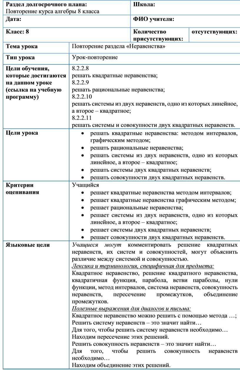 Раздел долгосрочного плана: Повторение курса алгебры 8 класса |