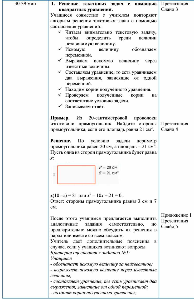 После этого учащимся предлагается выполнить аналогичные задания самостоятельно, но предварительно можно обсудить их решения в парах или вместе со всем классом. Учитель дает дополнительные пояснения в случае, если у учащихся возникают вопросы. Критерии оценивания к заданию №1: Учащийся - обозначает искомую величину за неизвестное; - выражает искомую величину через известные величины; - составляет уравнение, то есть уравнивает два выражения, зависящие от одной переменной; - находит корни полученного уравнения; - проверяет полученные корни на соответствие условию задачи; - записывает ответ.